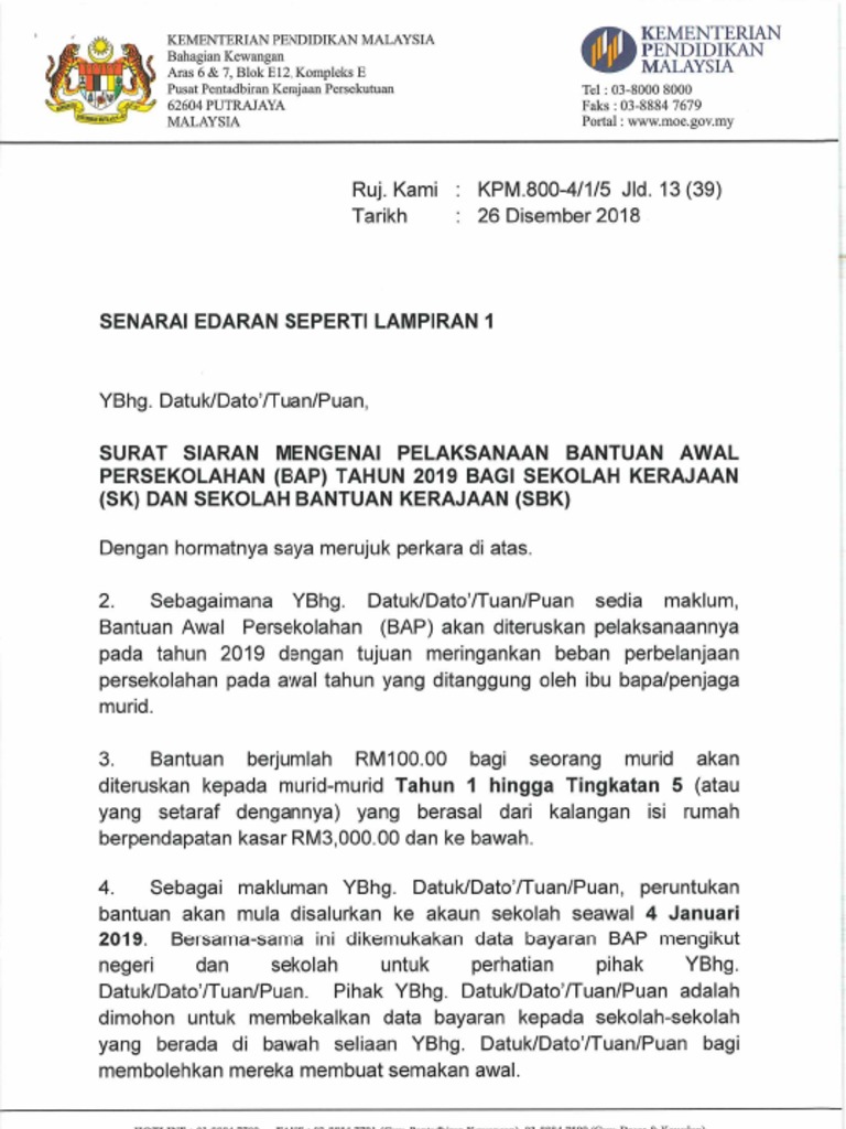 Surat Siaran Bap 2019 Sk Sbk Pdf. Bantuan Am Persekolahan Sekolah Rendah RM100 setahun Sekolah Menengah RM150 setahun. Menteri Kewangan Datuk Seri Tengku Zafrul Tengku Abdul Aziz berkata sejumlah RM450 juta diperuntukkan yang dijangka memanfaatkan 3 juta murid-murid yang layak.